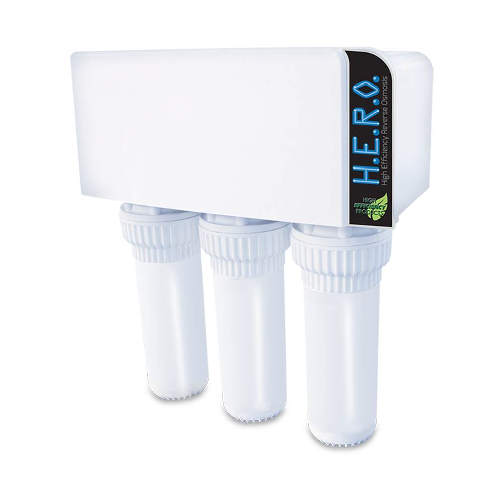 The H.E.R.O. wastes virtually no water with over 99.9% recovery. Purified water is collected in the storage tank. Rather than sending the remaining rinse water to drain, it is recycled back where it will be used throughout the house. Comparable systems typically waste 4-12 gallons for every gallon of R.O. water produced.